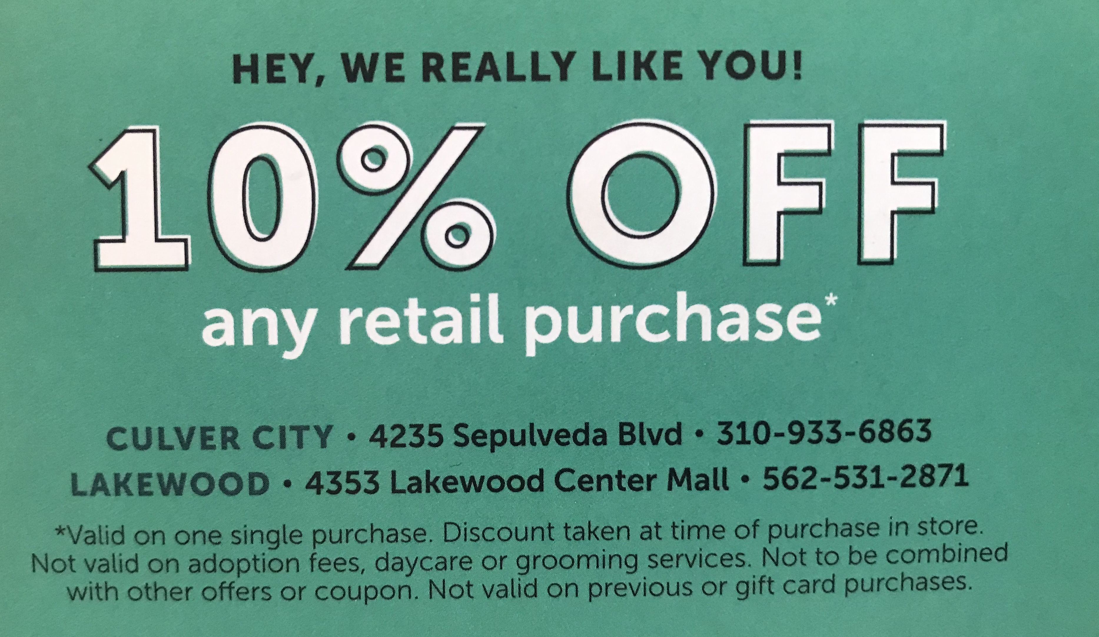 10% OFF any retail purchases made at Adopt & Shop in Culver City and Lakewood.